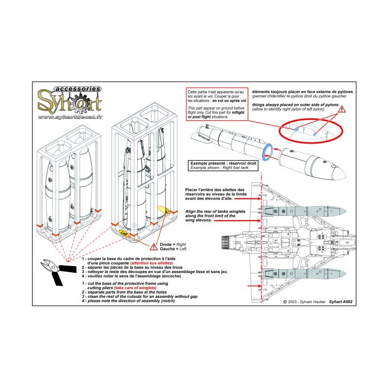 They are hollow in order to be light once placed under the wings, and do not have any irregularity due to printing. The engravings of the welds are finely reproduced in relief (such as the real welds), the various hatches and plugs are finely engraved on all the faces; finally the fins are thin but solid. The assembly is protected in a "cage" allowing transport and storage of the kit without breakage, in particular the fins