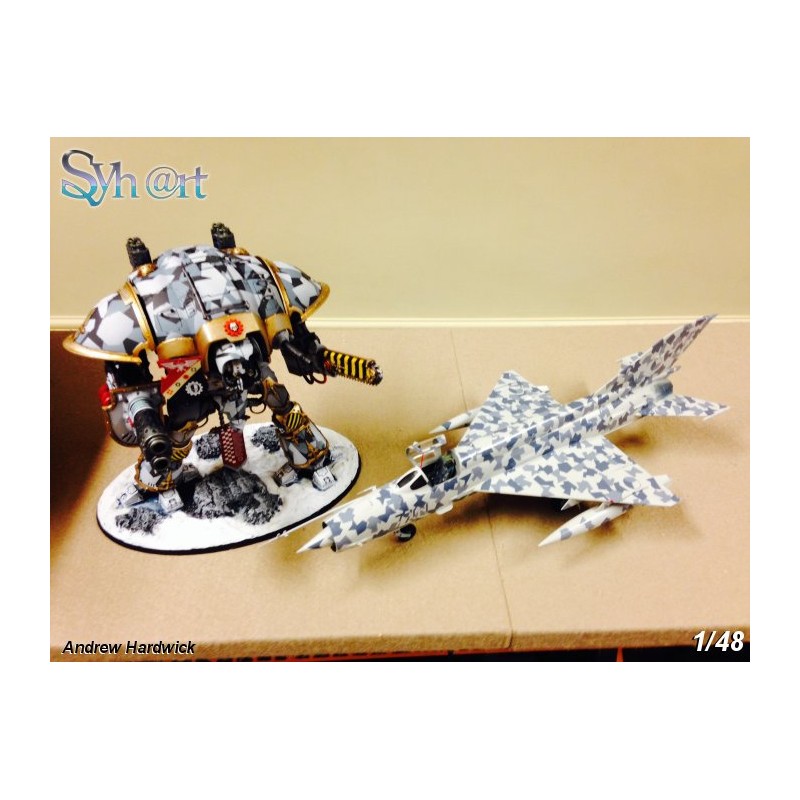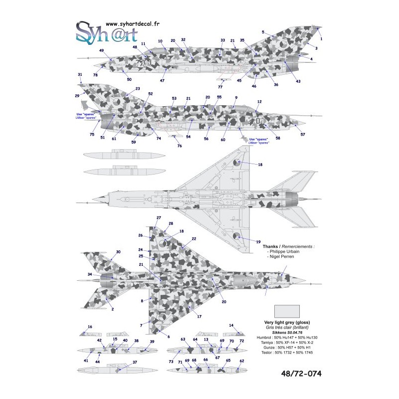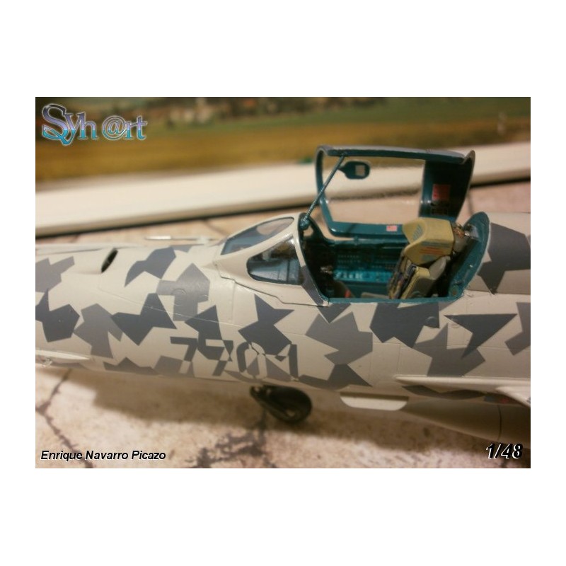 The NATO standards mainly based on various tones of grey in particular of air superiority Fighters. Several proposals were tested of like this original "Splinter" version painted in three tones of grey, applied to Mig-21MF 7701 from 1998. The proposal of "Splinter" camouflage was declined for the benefit of a camouflage in two tones of grey, while of numerous Mig-21 kept their natural metal schemes up to their retirement in 2005.