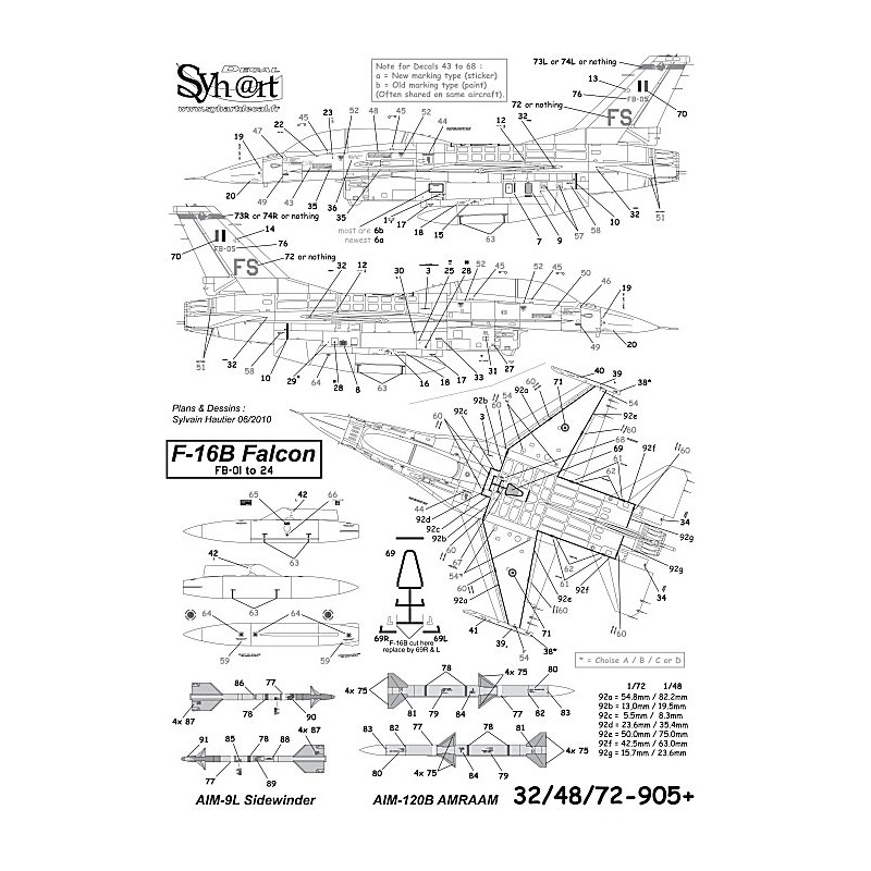 This decals sheet include all the standard stencils necessary for F-16A & B (also suitable for C, D and others Versions...) and the marks for 4x AIM-9L Sidewinder and 4x AIM-120B AMRAAM.