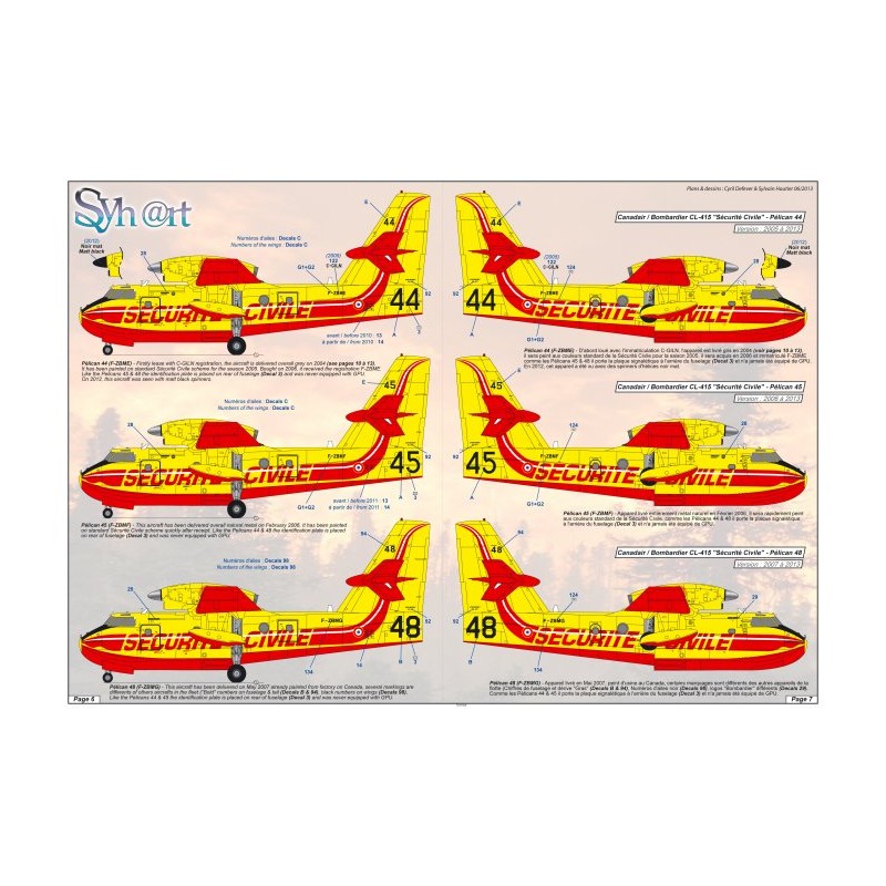 Decals with all the registrations of the Canadairs (callsigned Pélican) en servicing in the fleet since 1995 in included, as far as there variant through the years. This permit to choice yourself which aircraft of any seasons.