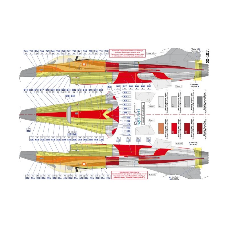 The project was designed to be easy to handle by modelers (Paint + decals application) for the best result, the solution was to develop the paints thats do not exist on modelling market (named : Red 1 to 4 and Silver 1 to 4), resins parts are also included (F-16 E-006 sensors).