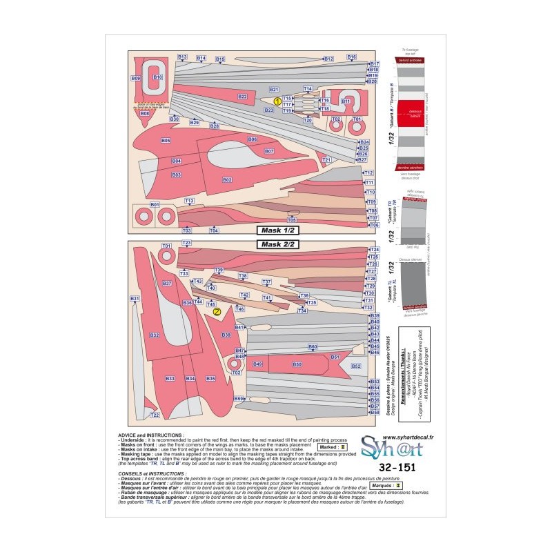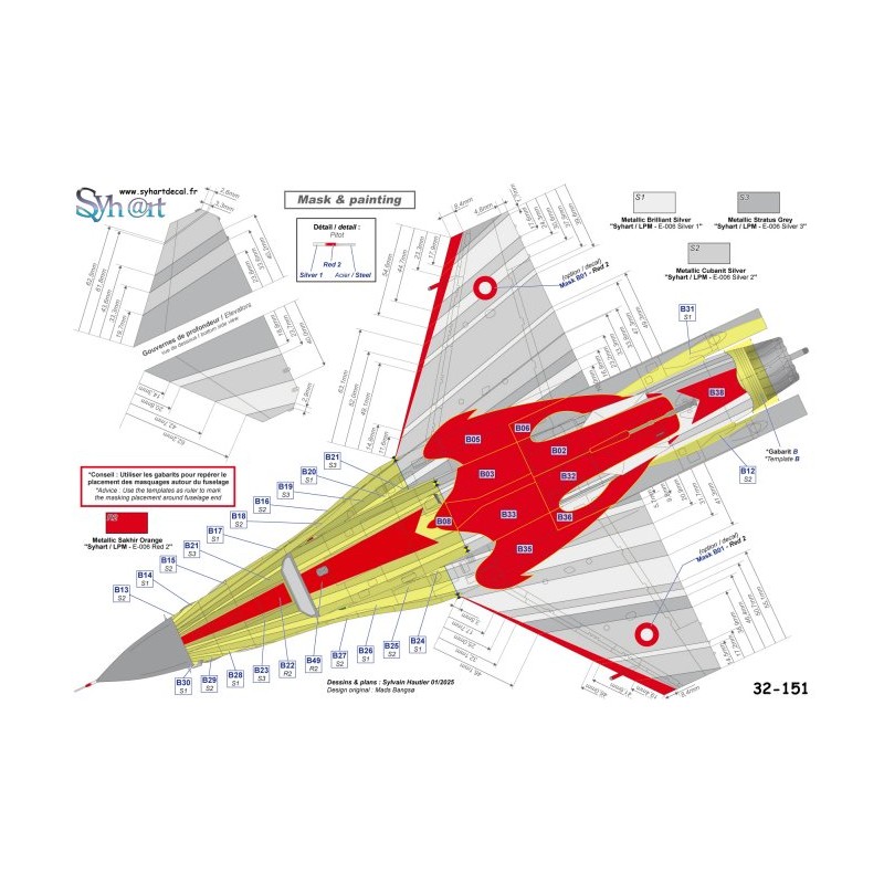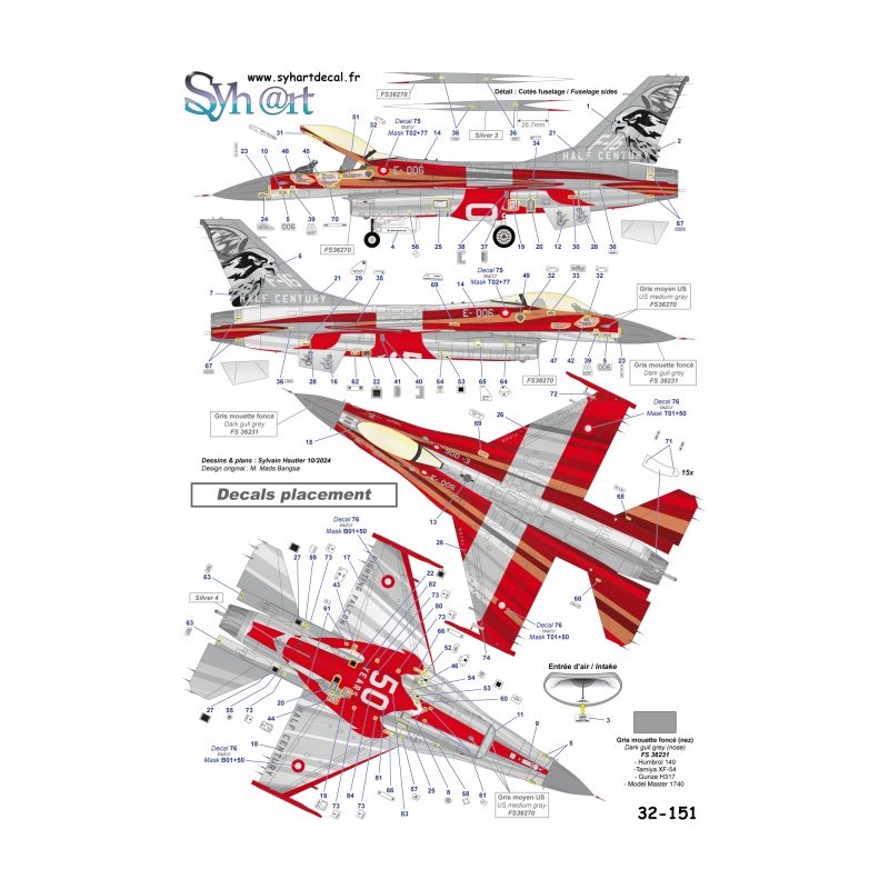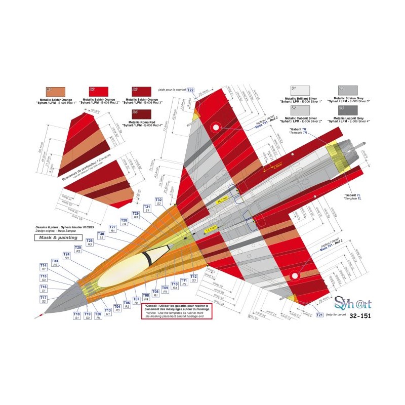The project was designed to be easy to handle by modelers (Paint + decals application) for the best result, the solution was to develop the paints thats do not exist on modelling market (named : Red 1 to 4 and Silver 1 to 4), resins parts are also included (F-16 E-006 sensors).