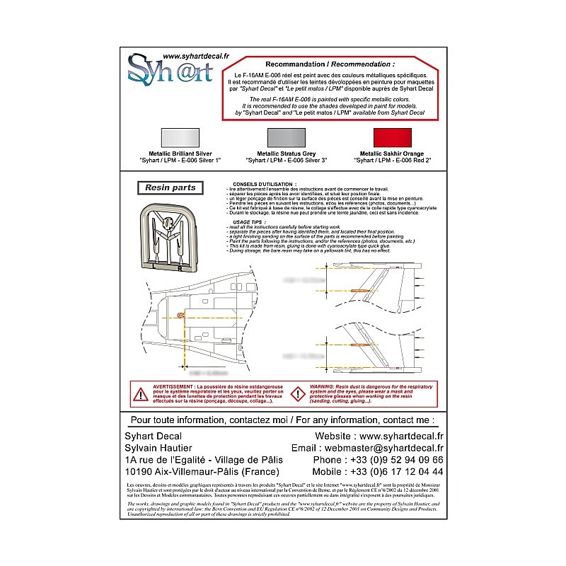 The project was designed to be easy to handle by modelers (Paint + decals application) for the best result, the solution was to develop the paints thats do not exist on modelling market (named : Red 1 to 4 and Silver 1 to 4), resins parts are also included (F-16 E-006 sensors).