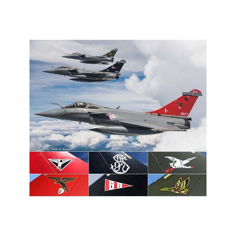 On 2017, as the squadron celebrates its 75th anniversary, and each badges celebrating its centenary is represented by a Rafale with a special tail decorated with the original insignia on the starboard, and the current insignia on the port side, all on a Green, Red or Black background.