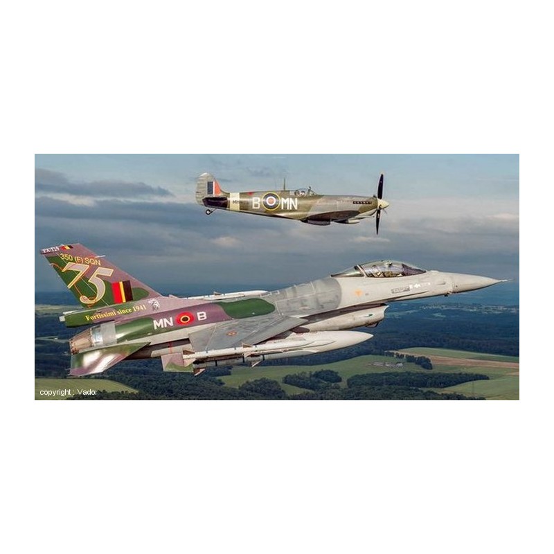 In 2016, for the 75th anniversary of the 350th Squadron, the F-16AM Falcon FA-129 receives a special scheme, coded MN-B, with spitfires colors on the tails and on the rear parts, it wear the roundels, of the RAF on the left, and the Belgian Air Force on the right.