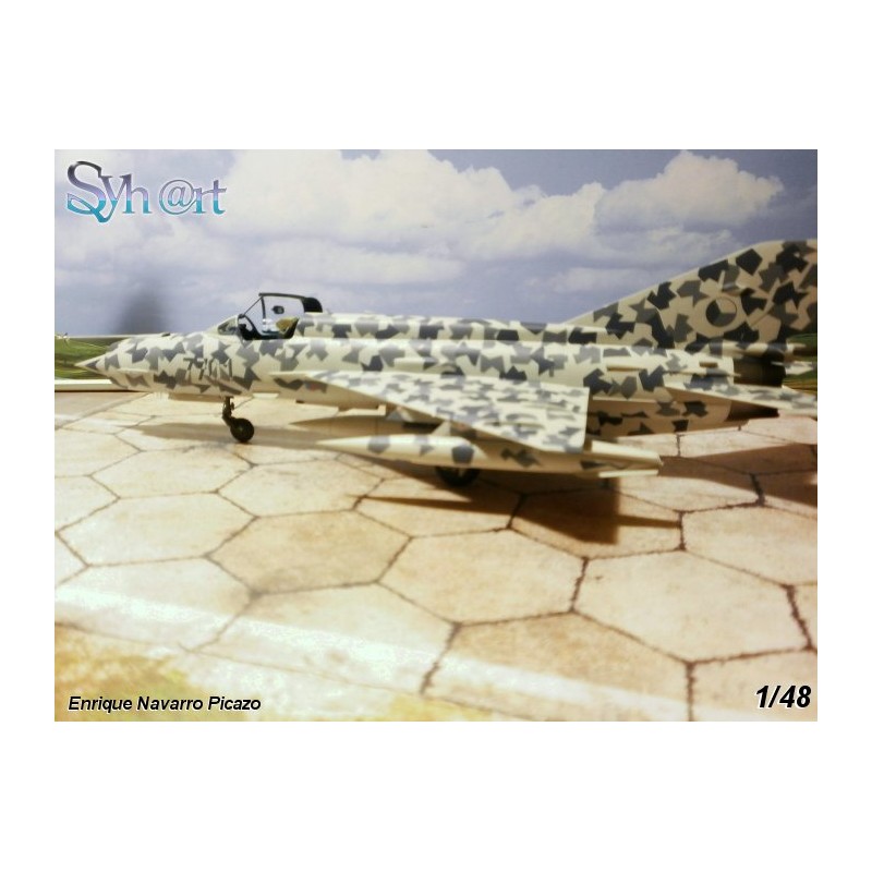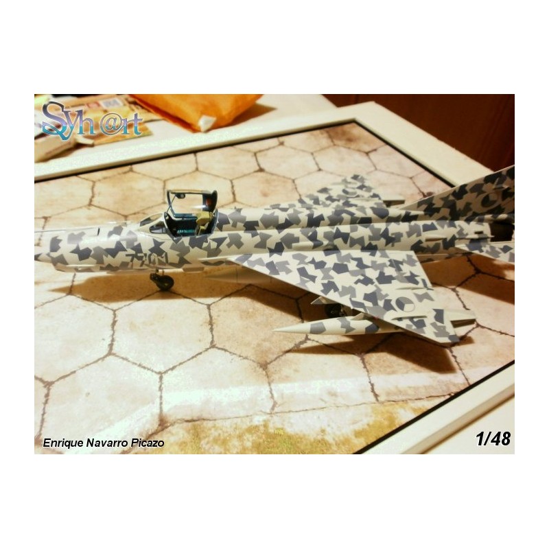 The NATO standards mainly based on various tones of grey in particular of air superiority Fighters. Several proposals were tested of like this original "Splinter" version painted in three tones of grey, applied to Mig-21MF 7701 from 1998. The proposal of "Splinter" camouflage was declined for the benefit of a camouflage in two tones of grey, while of numerous Mig-21 kept their natural metal schemes up to their retirement in 2005.