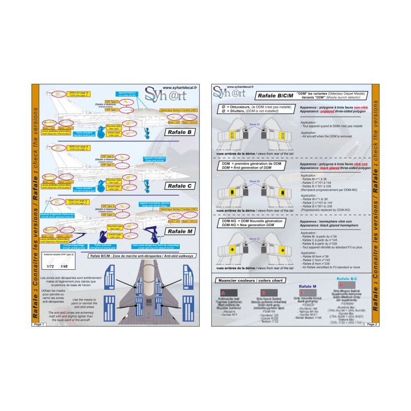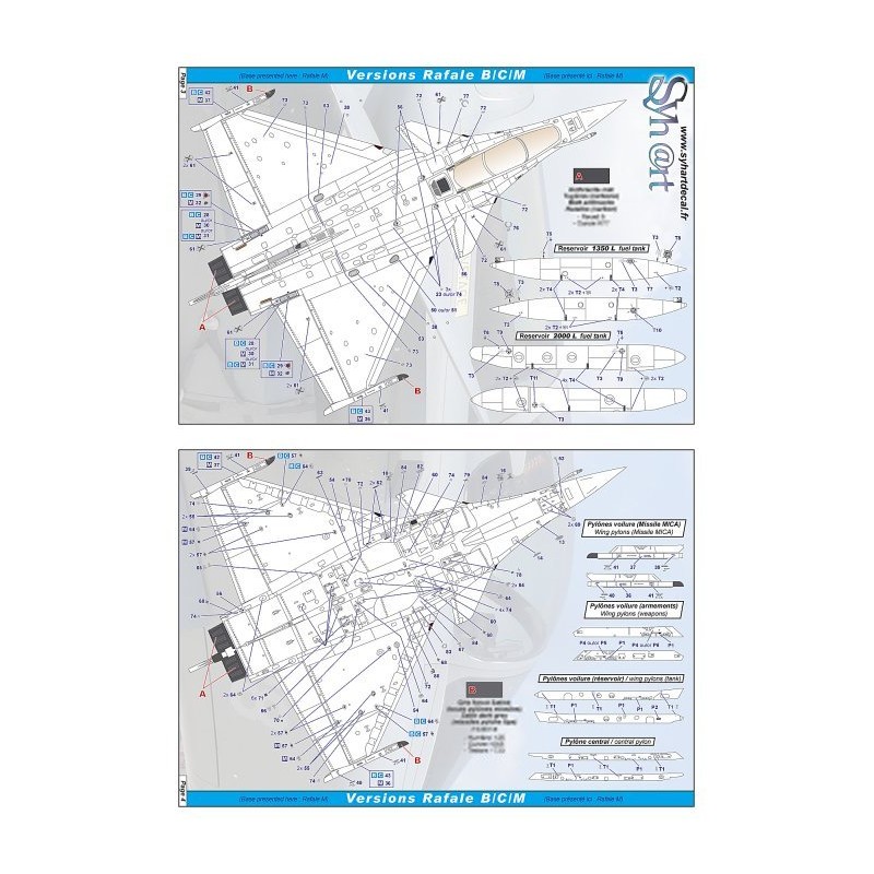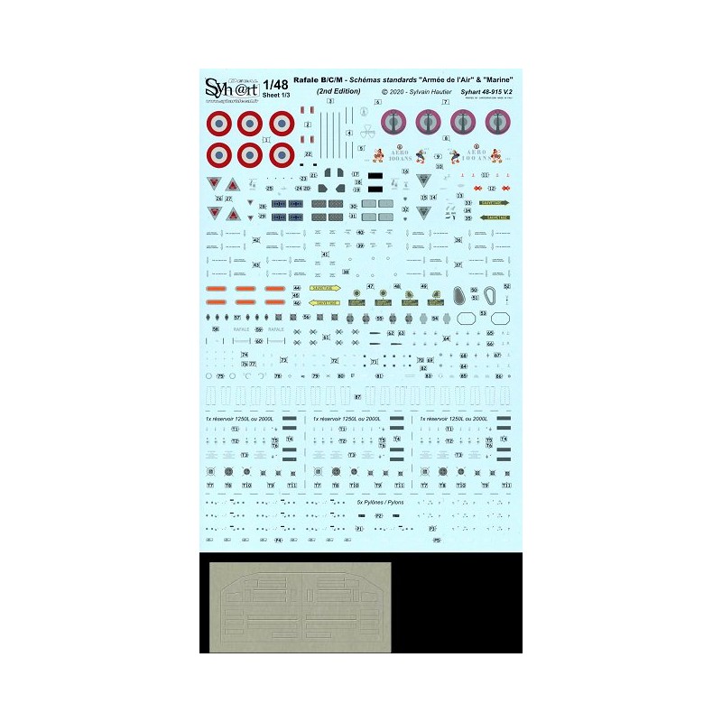 Indeed the reference Syhart 915v2 contains all the badges and registrations for french Rafale, but contains only one sheet with general stencils marks finally allowing to reproduce only one model of Rafale, while many others combinations (badges + registrations) remain possible.