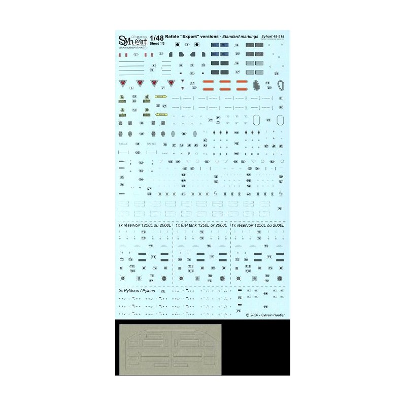 Indeed the reference Syhart 918, 920v2... contains all the badges and registrations for export Rafales, but contains only one sheet with general stencils marks finally allowing to reproduce only one model of Rafale, while many others combinations (badges + registrations) remain possible.