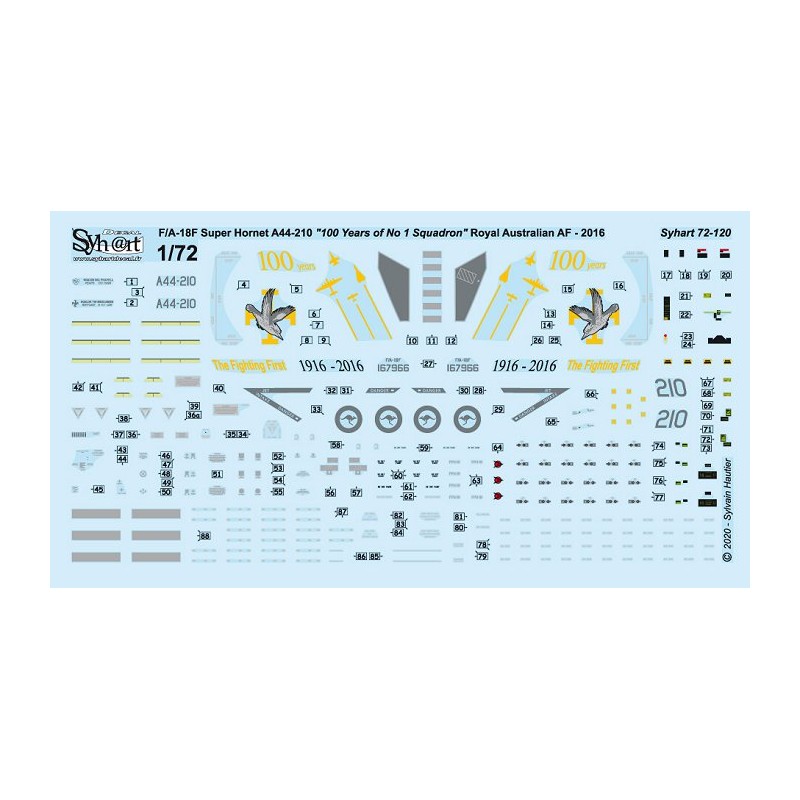 For the Century of the No 1 Squadron on 2016, it's one of these Super-Hornet, who received the special paint, The A44-210 tails was black painted with the yellow silhouettes of former aircrafts flown by the squadrons on inner sides, when the outer sides are orned with the insigna of the squadron No 1 since 100 years.