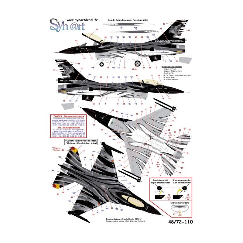 This paint scheme is characterized by a black nose, feather-shaped patterns along the fuselage and wings, and asymmetric horizontal stabilizers: on the right, the Belgian flag, and on the left, the flag of the host country during foreign airshow demonstrations.