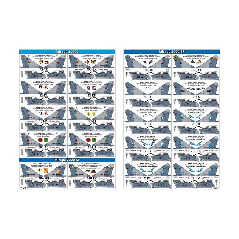 This decals set allows to accurately reproduce any of the "blue" Mirage 2000 (versions B, C or -5F) of Armée de l’air since entered in service till today, in the largest choice of versions (wings, squadrons or airbases, etc.).
