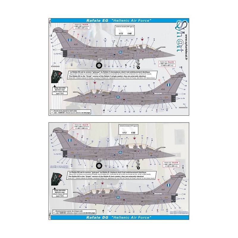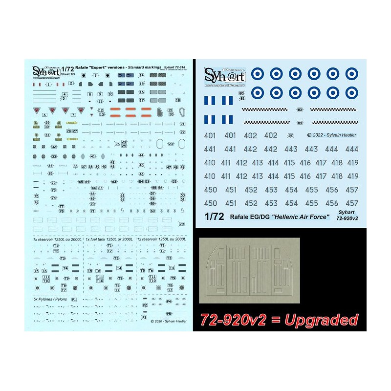 This decal set is an updated version of the Syhart 920 set released on 2022, it allows to accurately reproduce any of the Greek Rafales EG or DG including two sets of roundels, flags and squadron checkerboard fin flash.