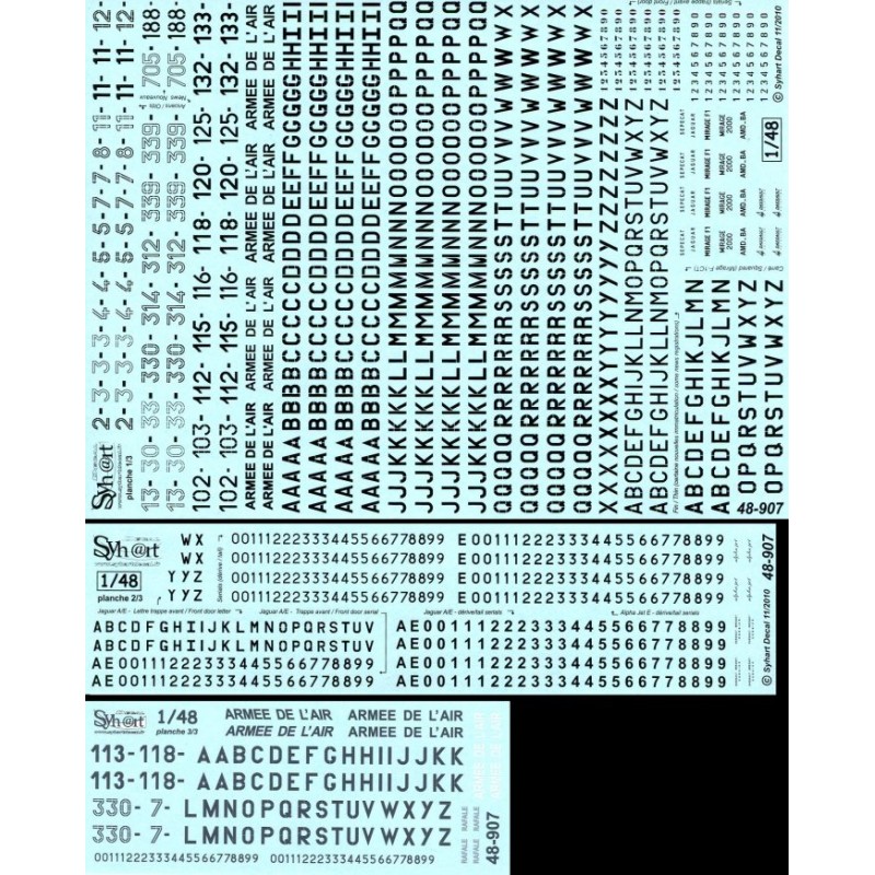 Planches de decalcomanies incluant la majeure partie des types d'immatriculations utilisées sur les chasseurs de l’Armée de l’air entre 1995 à 2010 (et plus tard...).