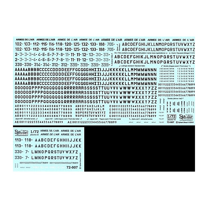 Planches de decalcomanies incluant la majeure partie des types d'immatriculations utilisées sur les chasseurs de l’Armée de l’air entre 1995 à 2010 (et plus tard...).
