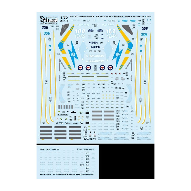 Pour le centenaire de l'escadron en 2017, c'est l'un de ces tout nouveaux growlers, qui a reçu une décoration spéciale, le A46-306 a été peint avec la dorsale et les doubles dérives en bleu nuit, avec des marquages bleu clair, les dérives sont ornées de grands boomrangs jaune, l'insigne de l'escadron No 6 depuis 100 ans.