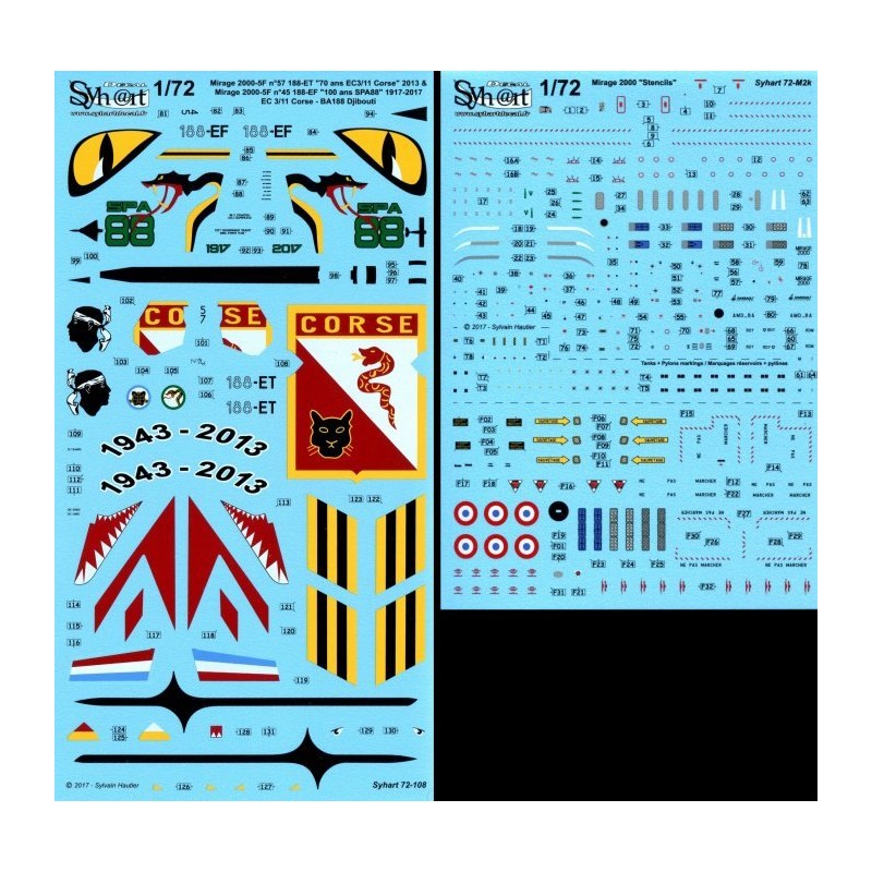 Ce set de décalcomanies contient une seule planche de marquages de servitudes ou "Stencils" (permettant de faire un seul appareil). Ces marquages de servitudes sont également disponible séparément sous la référence Syhart 919. Vous pourrez ainsi réaliser le second appareils proposés dans ce set sans avoir à vous procurer un nouveau set complet.