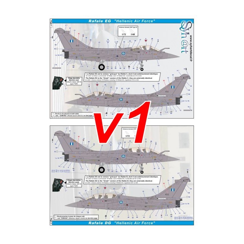 Ce set de décalcomanies permet de reproduire un Rafale EG ou DG parmi les douze premiers appareils de la flotte Grecque en service, il contient un jeux de stencils, cocardes, et drapeaux.